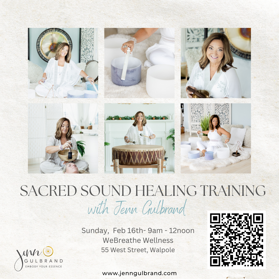 This transformative sound healing practitioner training is led by Jenn Gulbrand, owner of the WeBreathe Wellness Center, a Spiritual Well-Being Coach and Integrated Energy Healer dedicated to empowering others to heal and thrive.